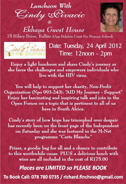 Join Cindy at Ekhaya Guest House on the 24th April 2012 @12h00 - 14h00